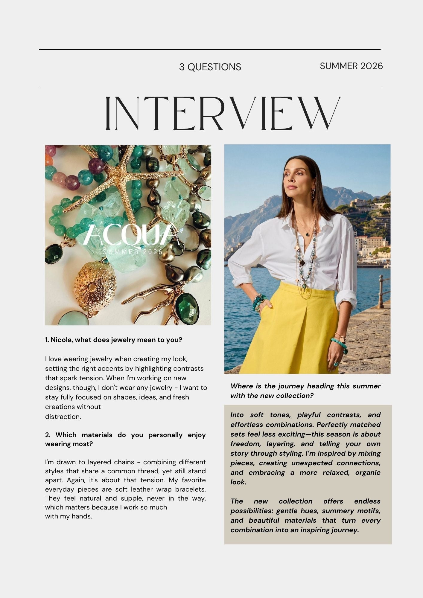 Die neue Sommerkollektion ACQUA ist eine Hommage an das Element, das fließt und sanft umschmeichelt, die unendliche Strömung – an die sanfte Bewegung, die uns trägt und verbindet.